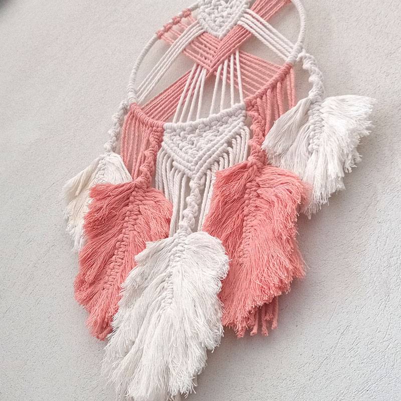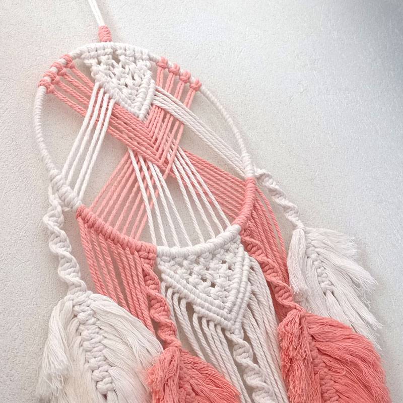 Un delicato acchiappasogni creato con la tecnica del macramè con fili di cotone.