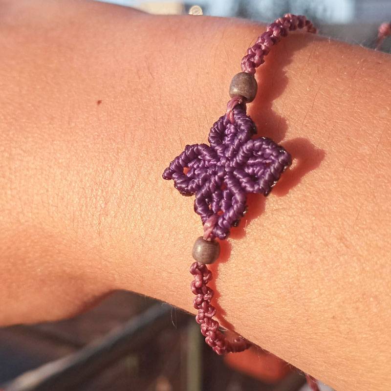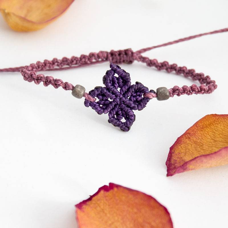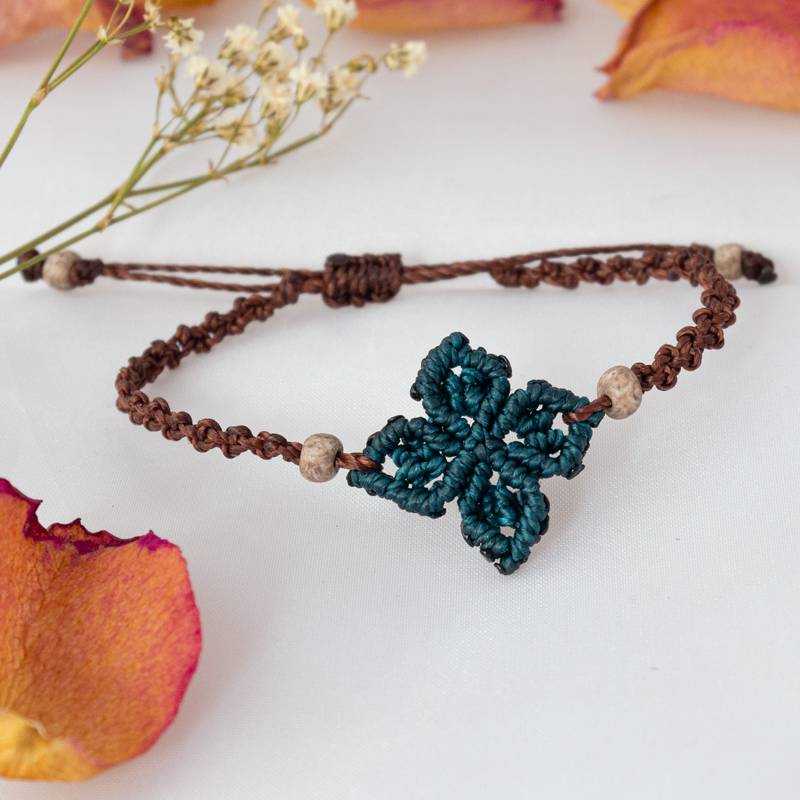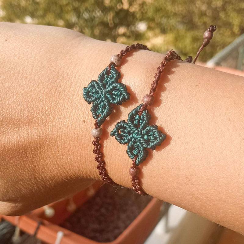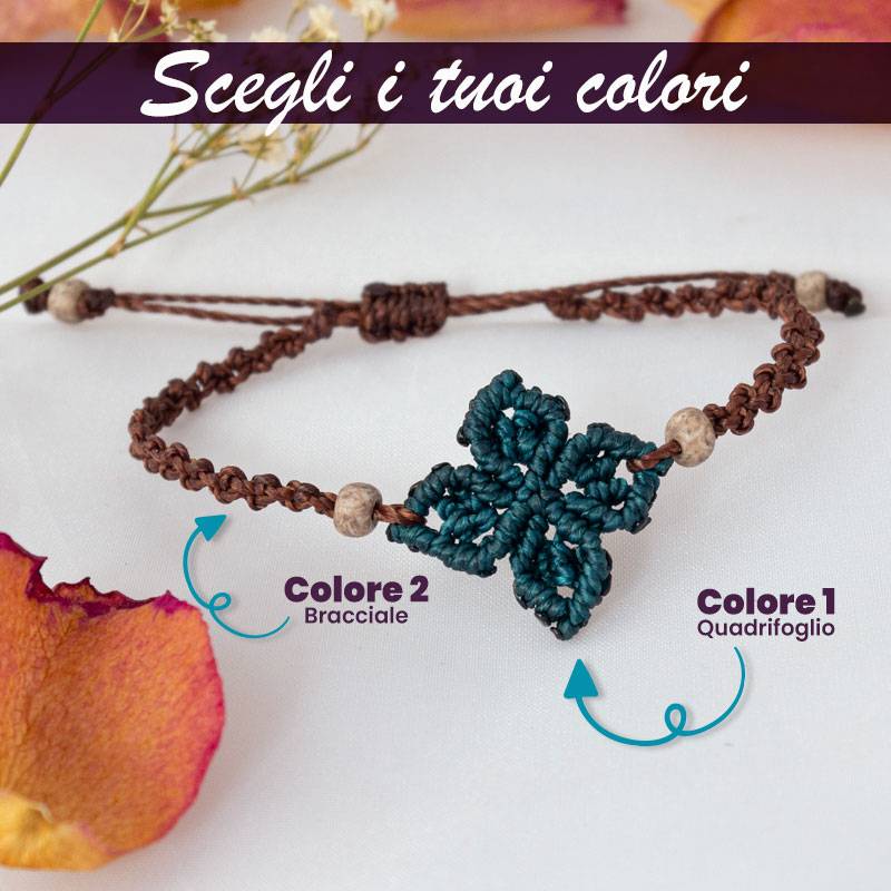 Questo braccialetto in macramè presenta un quadrifoglio centrale realizzato tramite l’intreccio dei nodi, integrato in un cinturino lavorato a spirale. Leggero e non ingombrante, è ideale da abbinare ad altri bracciali o orologi.