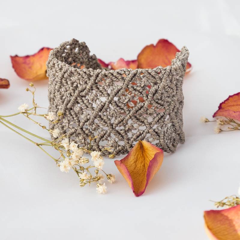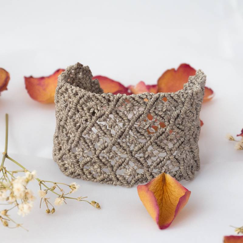 Questo bracciale è un esempio di alta artigianalità: non si tratta di uncinetto, ma di una complessa architettura di nodi macramè. La lavorazione crea una texture tridimensionale ma soffice, con un pattern geometrico che alterna parti piene a spazi vuoti.