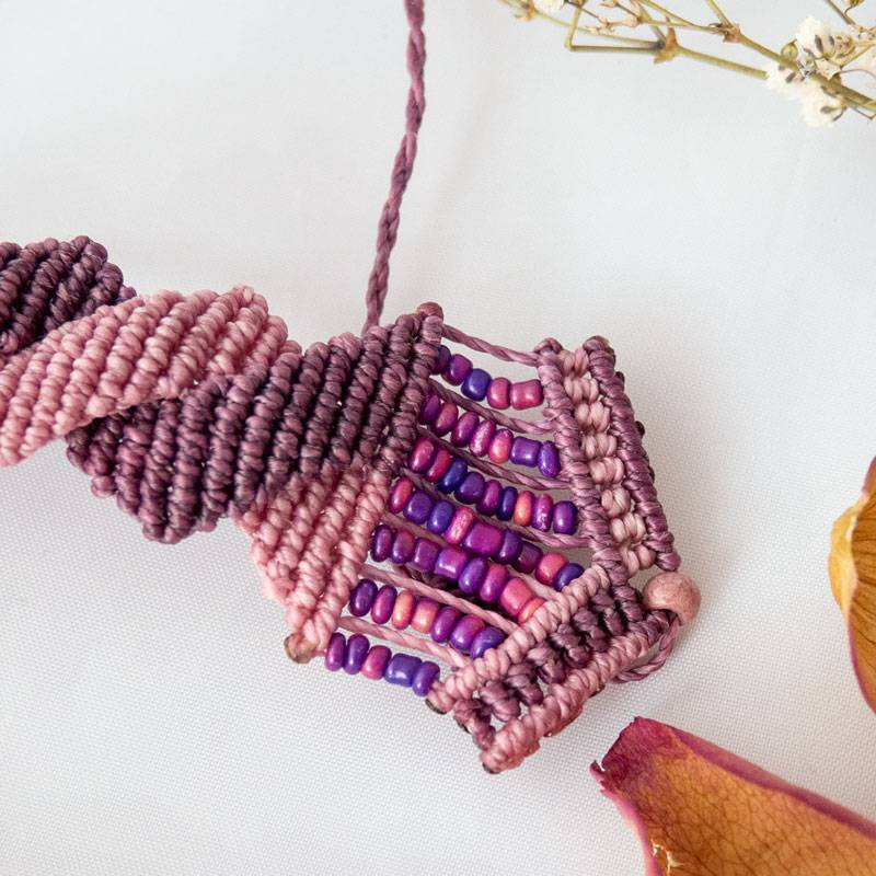 I fili macramè viola e dusty rose abbracciano le perle, aggiungendo profondità e intricata bellezza. Le tonalità più accese delle perline viola conferiscono al bracciale un tocco vibrante.