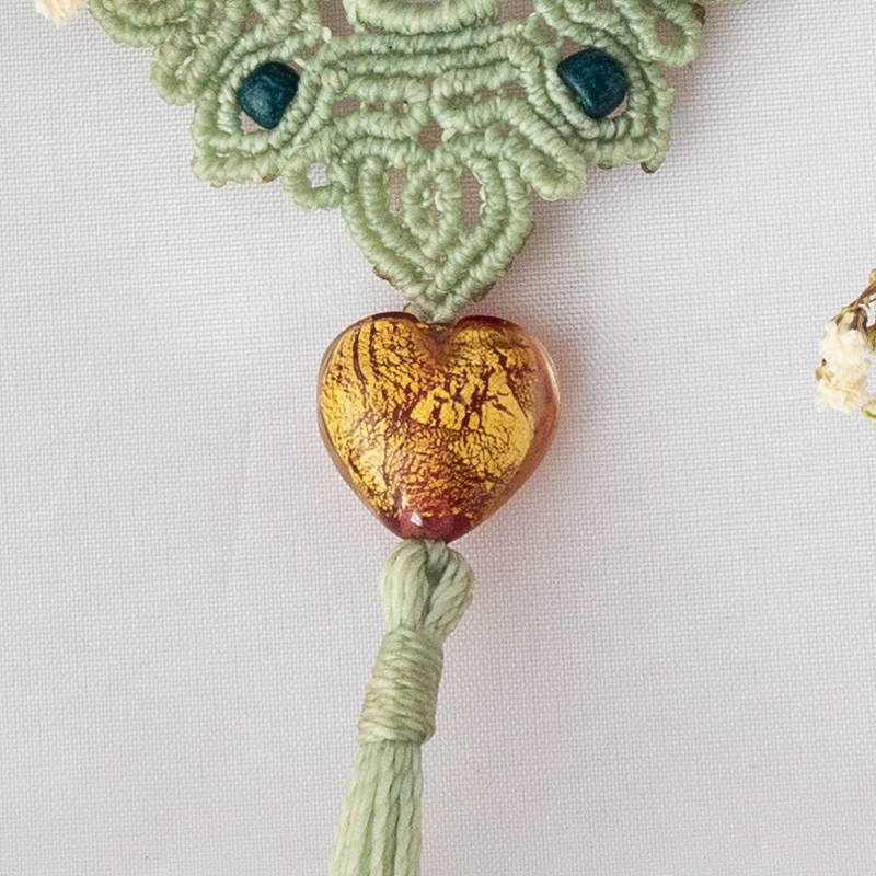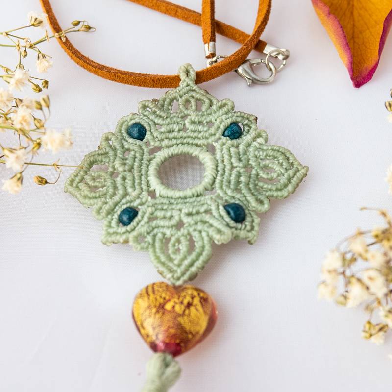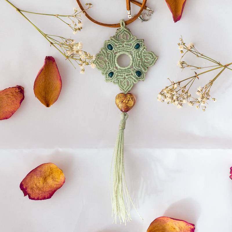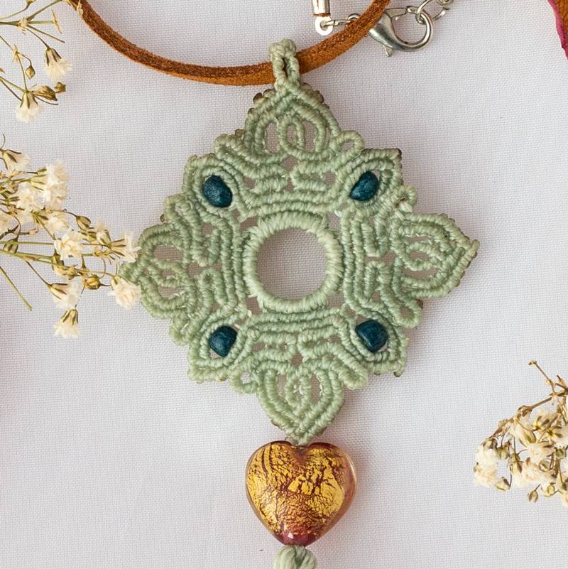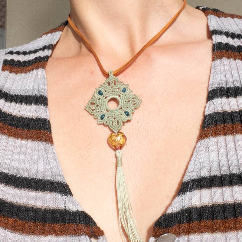 La collana macramè Lotus verde lichene è composta da un collarino in pelle marrone chiaro che offre un tocco di calore, avvolgendo delicatamente il collo. Il pendente in macramè, realizzato in un verde lichene vibrante, ricorda in modo discreto quattro figure in posizione del loto intorno a un cerchio centrale. Le quattro perle verdi scure aggiungono un tocco di raffinatezza senza eccessi.