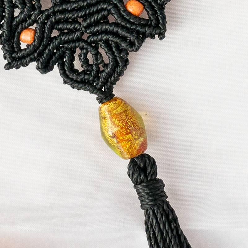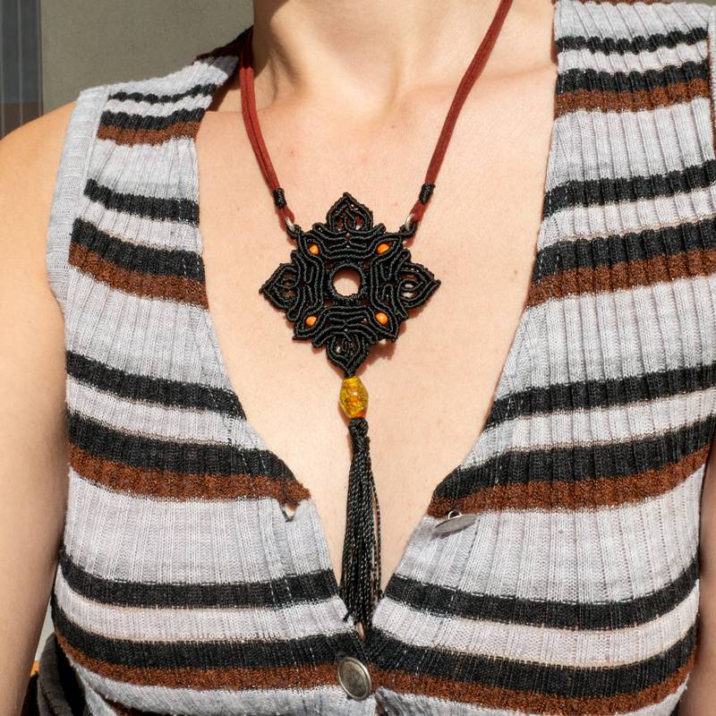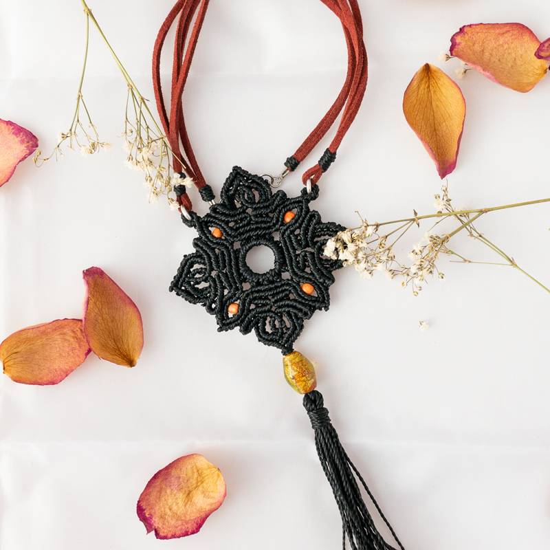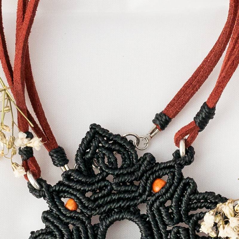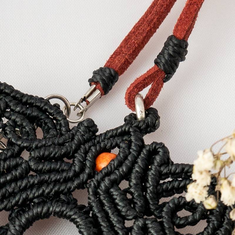 Crea un legame avvolgente con l’eleganza e la spiritualità con la collana macramè Lotus nera, caratterizzata da un morbido collarino in pelle color rosso vino che abbraccia con grazia il collo. Un’esperienza visiva avvolgente, se osservata attentamente, rivela una lavorazione che evoca l’immagine di quattro persone nella rilassante posizione del loto, sedute intorno a un cerchio centrale.