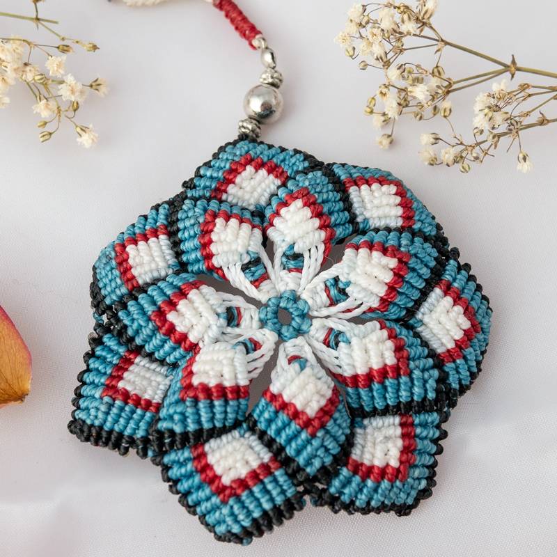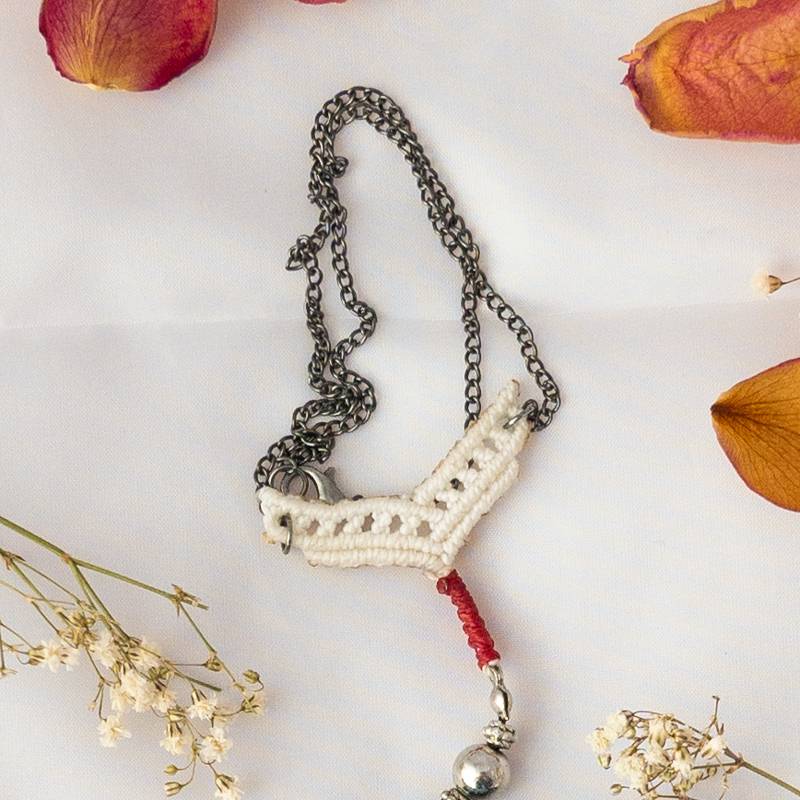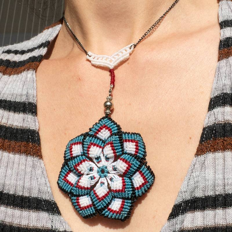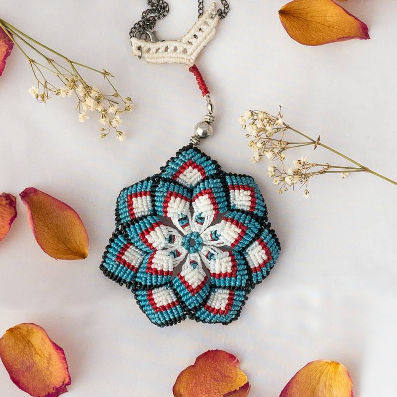 Risplendi con la Collana macramè Mandala, un tributo alla bellezza e all’armonia. Una semplice catenina in metallo offre la cornice perfetta per il meraviglioso pendente a forma di mandala. Con una palette di colori vibranti, tra cui bianco, celeste, rosso e nero, questa creazione cattura l’essenza della grazia e della delicatezza.