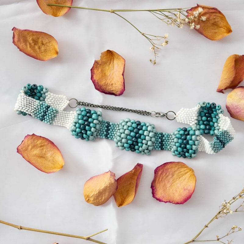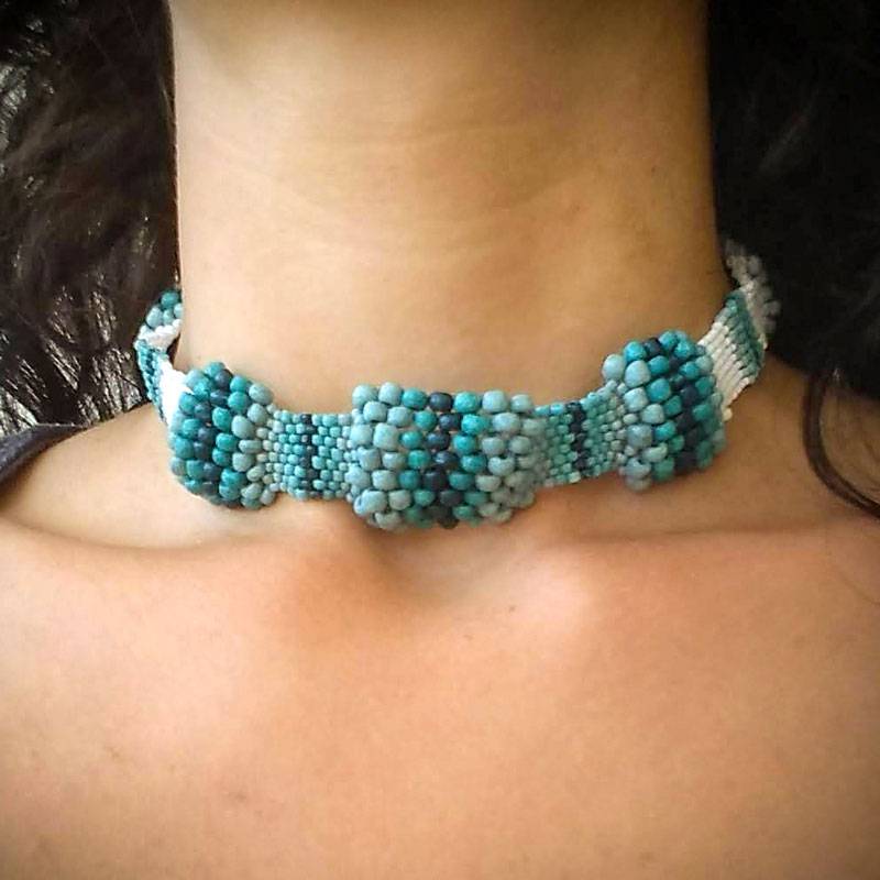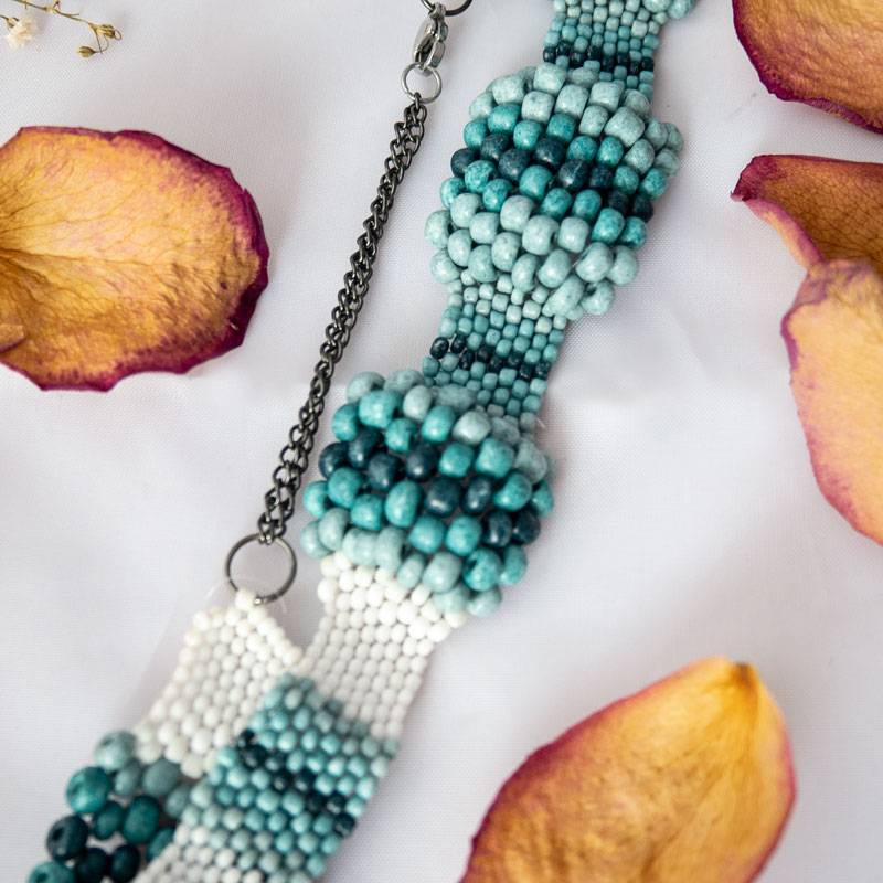 Un’armonia di perle in quattro gradazioni di verde, dallo scuro al verde acqua, con forme che evocano la bellezza dell’oceano.