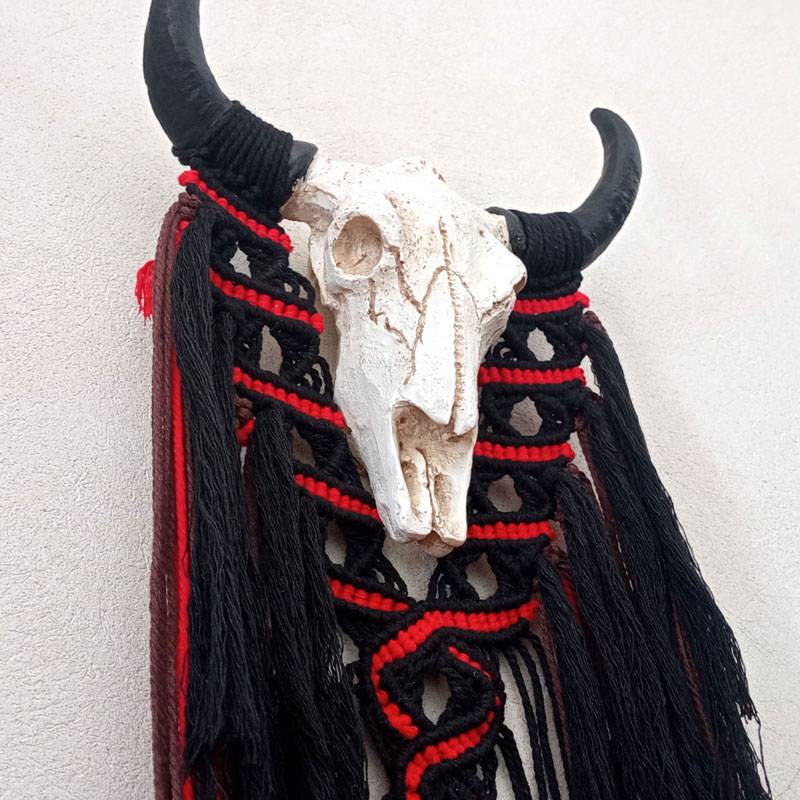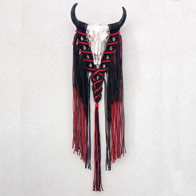 Questa decorazione murale macramè western è un pezzo di grande impatto, pensato per chi cerca qualcosa di unico e dal carattere forte. Il teschio al centro, circondato da intrecci di macramè in nero e rosso, evoca atmosfere western e tribal chic, portando con sé una potente energia decorativa. I nodi e le frange lunghe aggiungono un senso di movimento, mentre i colori contrastanti creano un effetto visivo audace.